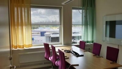 Wavegardiner i konferensrum. Panelgardiner i matsal samt rullgardiner med screenväv. Projekt: Lindgården i Fagersta.